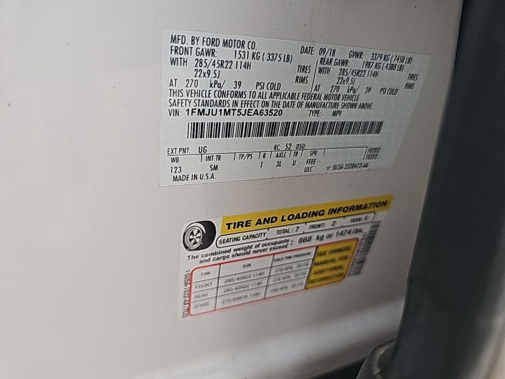 White Platinum Clearcoat Metallic Platinum EcoBoost 3.5L V6 GTDi DOHC 24V Twin Turbocharged 4WD Bluetooth®, 12 Speakers, 22 Polished Aluminum Wheels, 2nd Row Bucket Seats, 3rd row seats: split-bench, 4-Wheel Disc Brakes, ABS brakes, Adaptive suspension, Adjustable pedals, Air Conditioning, AM/FM radio: SiriusXM, AppLink/Apple CarPlay and Android Auto, Auto High-beam Headlights, Auto-dimming door mirrors, Auto-dimming Rear-View mirror, Automatic temperature control, Brake assist, Bumpers: body-color, CD player, Compass, Delay-off headlights, Driver door bin, Driver vanity mirror, Dual front impact airbags, Dual front side impact airbags, Electronic Limited Slip w/3.73 Axle Ratio, Electronic Stability Control, Emergency communication system: SYNC 3 911 Assist, Equipment Group 600B, Exterior Parking Camera Rear, Four wheel independent suspension, Front anti-roll bar, Front Bucket Seats, Front Center Armrest, Front dual zone A/C, Front fog lights, Front reading lights, Fully automatic headlights, Garage door transmitter, Genuine wood console insert, Genuine wood dashboard insert, Genuine wood door panel insert, Heated & Cooled Perforated Leather Fr Bucket Seats, Heated door mirrors, Heated front seats, Heated rear seats, Heated steering wheel, Heavy-Duty Engine Radiator, Heavy-Duty Trailer Tow Package, Illuminated entry, Integrated Trailer Brake Controller, Lane Departure Warning System, Leather steering wheel, License Plate Bracket, Low tire pressure warning, Memory seat, Navigation System, Occupant sensing airbag, Outside temperature display, Overhead airbag, Overhead console, Panic alarm, Passenger door bin, Passenger vanity mirror, Pedal memory, Power door mirrors, Power driver seat, Power Liftgate, Power moonroof, Power passenger seat, Power steering, Power windows, Pro Trailer Backup Assist, Radio data system, Radio: B&O PLAY Premium Audio System by harman, Rain sensing wipers, Rear air conditioning, Rear anti-roll bar, Rear audio controls, Rear reading lights, Rear window defroster, Rear window wiper, Reclining 3rd row seat, Remote keyless entry, Reversible Cargo Mat, Roof rack, Security system, SiriusXM Satellite Radio, Speed control, Speed-sensing steering, Speed-Sensitive Wipers, Split folding rear seat, Steering wheel memory, Steering wheel mounted audio controls, SYNC 3 Communications & Entertainment System, Tachometer, Telescoping steering wheel, Tilt steering wheel, Traction control, Trip computer, Turn signal indicator mirrors, Variably intermittent wipers, Ventilated front seats, Voltmeter. Odometer is 21343 miles below market average!Awards:* JD Power Initial Quality Study (IQS) * JD Power Automotive Performance, Execution and Layout (APEAL) Study, Initial Quality Study (IQS) * 2018 KBB.com Best Buy Awards * 2018 KBB.com Best Family Cars * 2018 KBB.com 10 Most Awarded Cars * 2018 KBB.com Brand Image Awards * 2018 KBB.com 10 Most Awarded BrandsWe make every effort to provide accurate information, including, but not limited to PRICE, MILES and VEHICLE OPTIONS, but please VERIFY with Wilson Auto Family before purchasing.